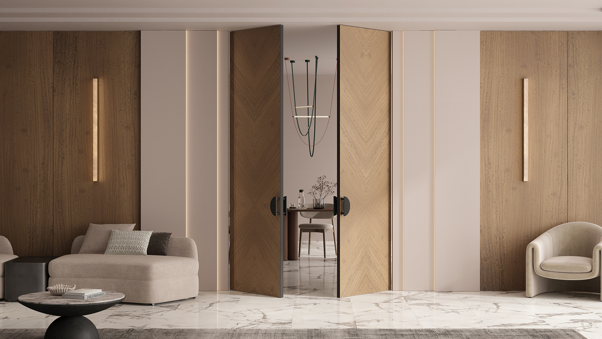 Полотно Rift в скрытом алюминиевом коробе становится полноценным элементом декора. В коллекции представлено 9 моделей дверей в высоте до 3 метров. Рисунок раскладки шпона варьируется от простого до сложного. «Рубашка» для каждого полотна подбирается вручную по цвету, текстуре и фактуре.