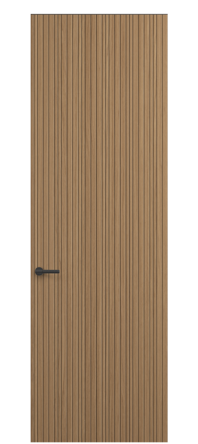 SELECT — коллекция минималистичных дверей с фрезеровкой по натуральному шпону. Рельеф на поверхности полотна создаёт игру света и тени, добавляя пространству динамичности и визуального объёма. Двери SELECT в сочетании со стеновыми панелями и мебельными фасадами, повторяющими лаконичный дизайн, создают единое стилевое решение.
